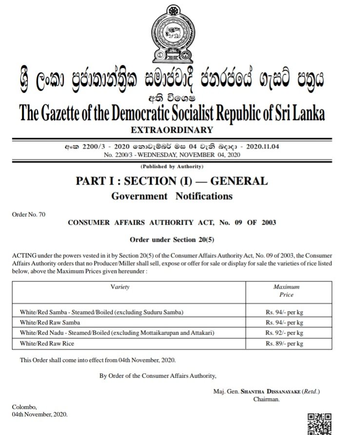 (UTV | COLOMBO) – The government has decided to set maximum retail prices for several varieties of rice, the Consumer Affairs Authority (CAA) announces.