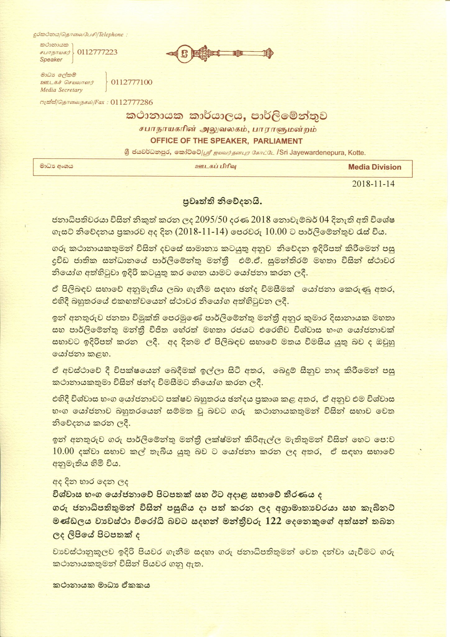 (UTV|COLOMBO) – A copy of the motion with 122 signatures of Parliamentarians who have signed the No Confidence Motion against Prime Minister Mahinda Rajapaksa and the newly-appointed Cabinet, has been sent to President Maithripala Sirisena.