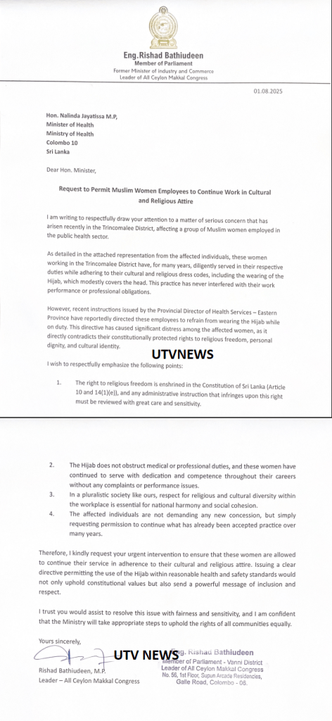 (UTV NEWS- Colombo) Rishad Bathiudeen, Member of Parliament and Leader of the All Ceylon Makkal Congress (ACMC), has formally appealed to the Minister of Health, Hon. Dr. Nalinda Jayatissa, urging immediate intervention to protect the constitutional rights of Muslim women employed in the public health sector in the Trincomalee District.