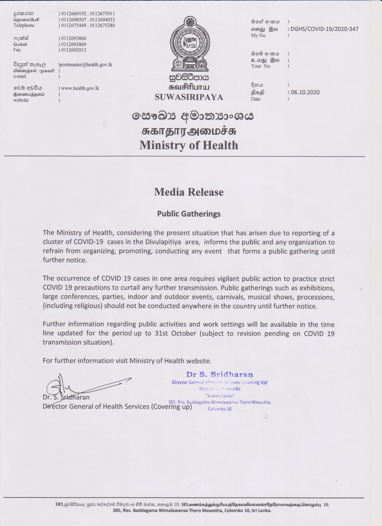 NATIONALPublic gatherings prohibited until further notice October 6, 2020October 6, 2020177 Share0 (UTV | COLOMBO) – Public gatherings such as exhibitions, conferences, parties, indoor & outdoor events, carnivals, musical shows, processions (including religious) have been prohibited until further notice, the Health Ministry said in a statement.