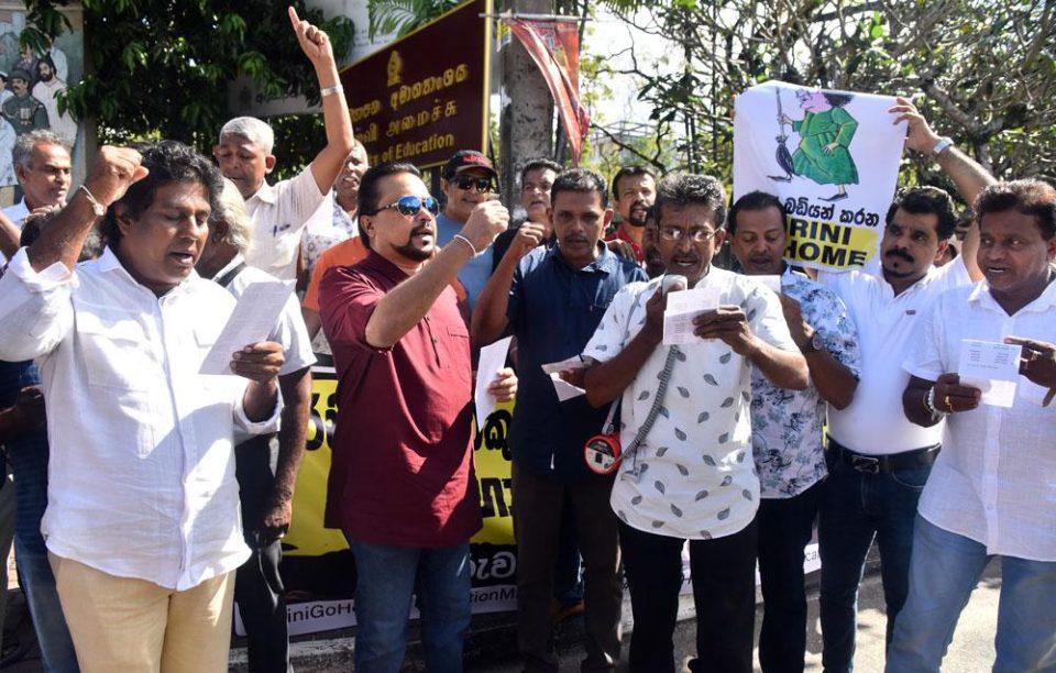 Former Minister Wimal Weerawansa, accompanied by civil society representatives and supporters, had begun a continuous ‘Satyagraha’ protest in front of the Education Ministry. The demonstration demands the withdrawal of the recently introduced education reforms and calls for Prime Minister Dr. Harini Amarasuriya to resign from her position as Education Minister.